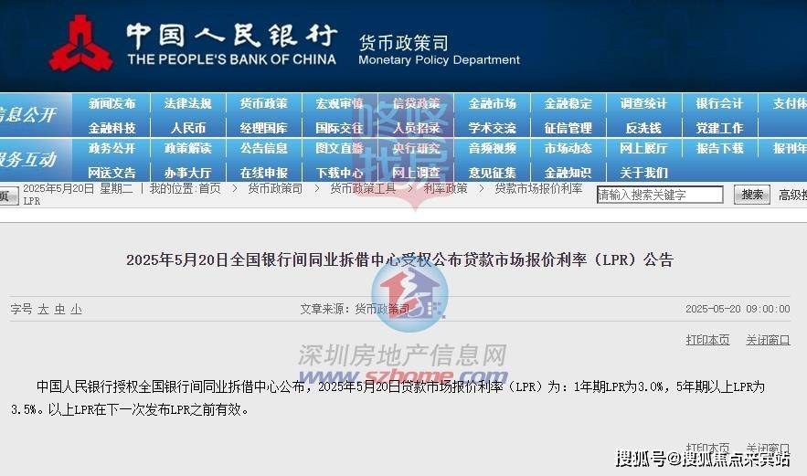 中国人民银行授权全国银行间同业拆借中心公布,2025年5月20日贷款市场报价利率(LPR)为:1年期LPR为3.0%,5年期以上LPR为3.5%。以上LPR在下一次发布LPR之前有效。