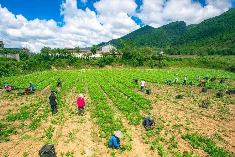 8月20日,丰都县武平镇新合场村,村民在蓝天白云下的香菜基地里采收香菜。通讯员 林登周 摄