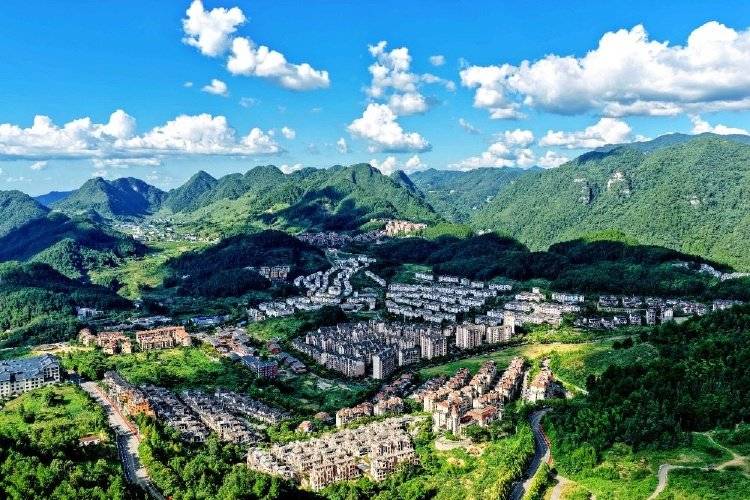 8月20日,万盛经开区黑山镇北门村,蓝天白云下,一栋栋白墙黑瓦的高山生态搬迁新村联建房造型雅观、错落有致,与旅游度假区地产互为映衬、相得益彰,共同融入苍郁黑山的美丽景色之中(无人机照片)。通讯员 王泸州 摄