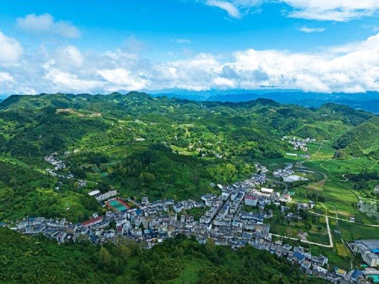 8月20日,彭水县大同镇,蓝天白云映衬下的集镇风光(无人机照片)。特约摄影 赵勇