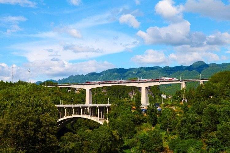 8月20日,一列从黔江开往张家界的高铁动车组穿过蓝天白云下的黔江区城市大峡谷景区。特约摄影 杨敏