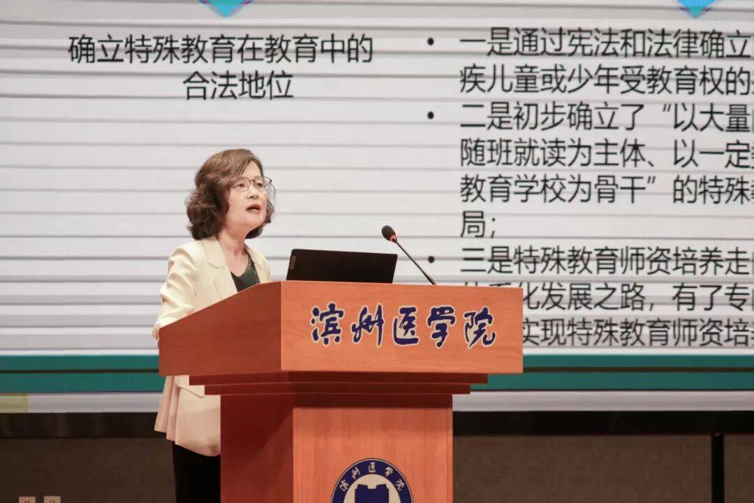 崔保华全面介绍了滨州医学院四十年来以“残健融合、教康结合”模式培养残障人才,创造了多个业界“第一”的创业历程:1985年,学校设临床医学二系,开创我国残疾人高等医学教育先河;2012年招收全国首个医学院校视障生(中医学专业),2018年招收首个医学院校听障生(口腔医学技术专业)。学校投资2亿元建设120亩“国家特殊教育示范园区”,打造无障碍环境;定制人才培养方案,改革教学手段,改造教学环境,设立“扶残筑梦”系列资助项目,建设多类实践基地,帮助残疾学生获取执业医师资格证、教师资格证等证书,毕业生就业率超98%。