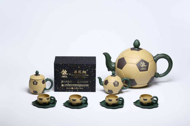 板块“C位”,金光闪闪的“苏超”冠军奖杯在聚光灯下熠熠生辉。环顾四周,老字号联名产品与十三地市文创周边汇聚一堂:一度脱销的爆款“十三太保”城市IP盲盒、吉祥物“豚宝”精彩亮相,恒顺醋坛抱枕让老字号变潮玩。新华日报·交汇点与江苏老字号紫砂品牌华凤翔积极联动,创意设计推出的“江苏十三画,个个美如画”足球紫砂壶套组,将江苏传统文化与现代足球元素巧妙融合,既展现了江苏深厚的文化底蕴,又体现了苏超足球的活力与激情。