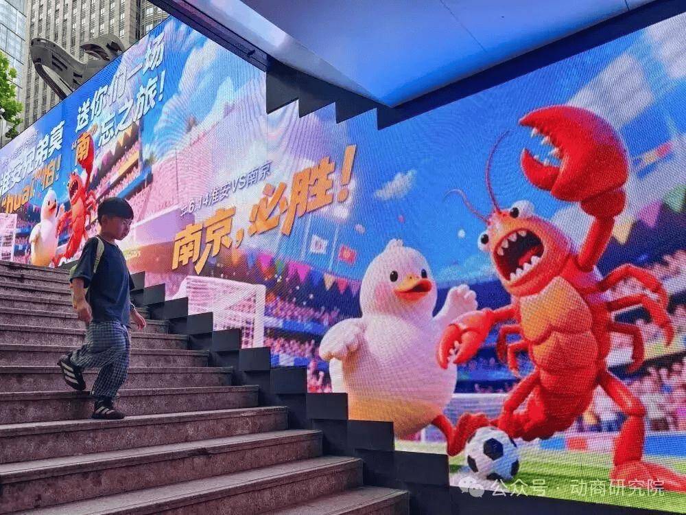 6月10日,一位小朋友经过南京一所商场旁的“苏超”广告牌。新华社记者李博摄