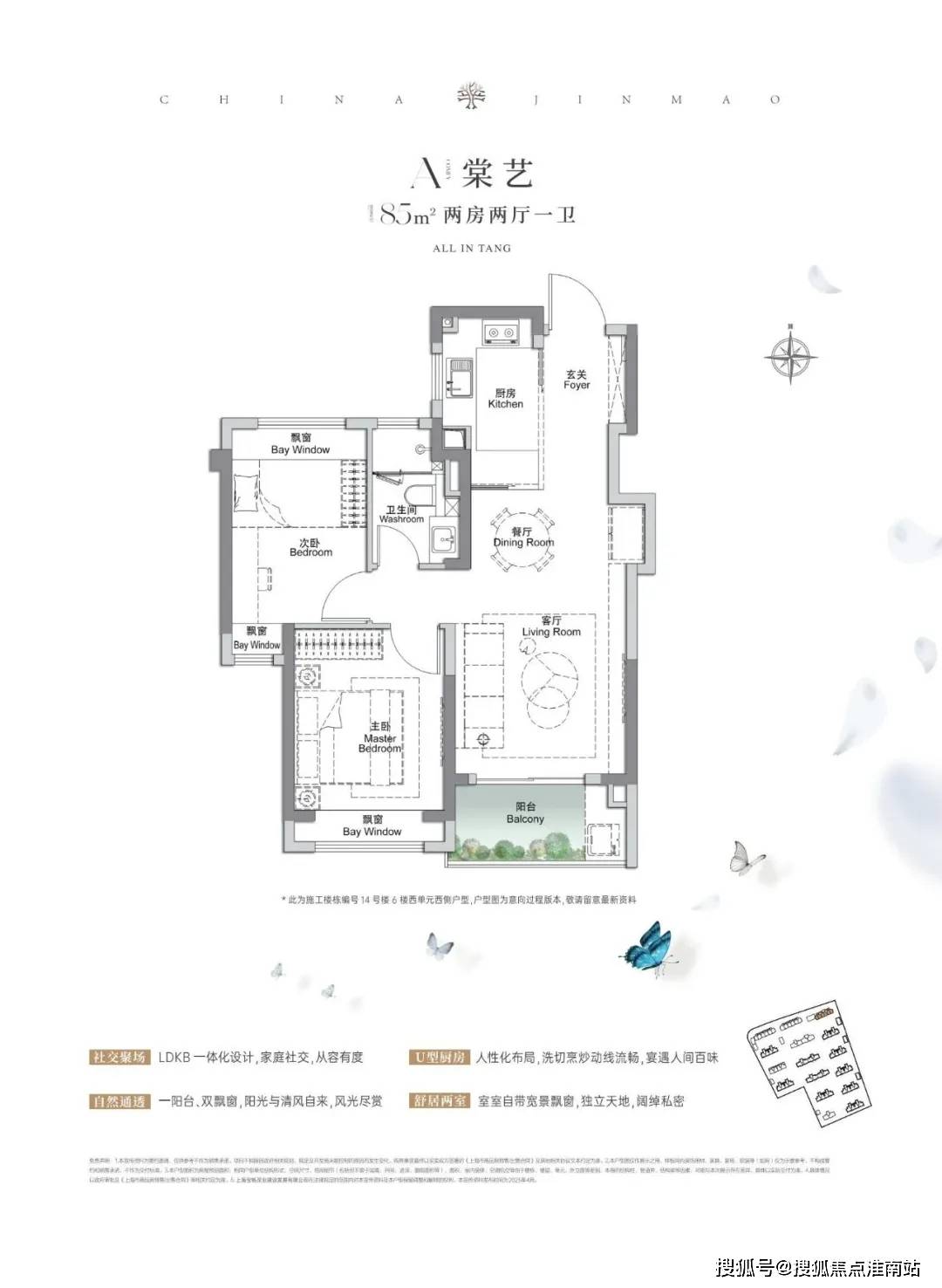 建面约85㎡2房2厅1卫,做到了双开间朝南+3个飘窗+LDKB一体化设计,附加空间非常多。