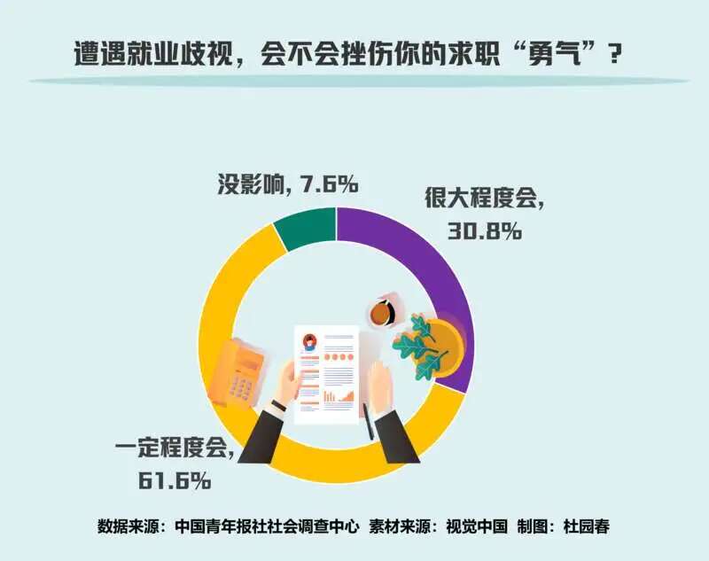 中国青年报社社会调查中心联合问卷网(,对1333名应届生进行的一项调查显示,92.4%的受访大学生表示若遭遇就业歧视会挫伤自己的求职勇气。减少就业歧视,62.6%的受访大学生建议推进户籍制度改革,57.1%的受访大学生呼吁建立健全促进公平就业的法律法规。