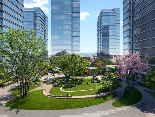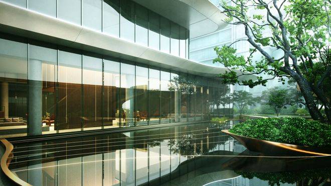 在绿城·凤咏朝阳整体设计中,采用围合式建筑布局,在约13000㎡的园林绿境中,点状布置了7栋【水晶天幕】楼宇,以自然资源均好性,营造栋栋被花园包裹、户户可观景的绿意生活