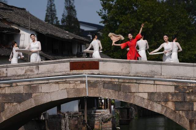 10月24日,表演者在新市古镇万象桥表演民间舞《丝丝簸影》。新华社记者 黄宗治 摄