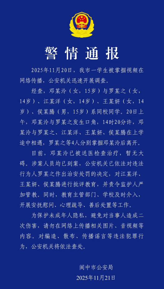 四川阆中15岁女生在上学途中被多人掌掴,警方通报:5人系同校同学,对罗某之(女,14岁)治安处罚,另外3人批评教育。