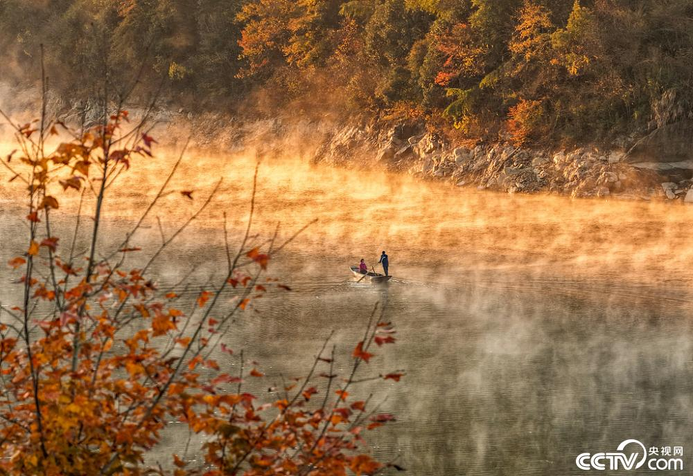 安徽省黄山市徽州区呈坎镇容溪村丰乐湖上晨雾飘荡,霞光鎏金般洒向湖面,村民在朦胧雾霭中泛舟而行,船桨轻摇泛起粼粼波光,光影交融,宛若一幅天然绘就的江南水乡画卷。