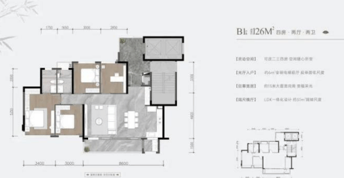 设计亮点:全明空间,6.4米横厅+双面宽阳台,主卧套房设计,独立玄关收纳。