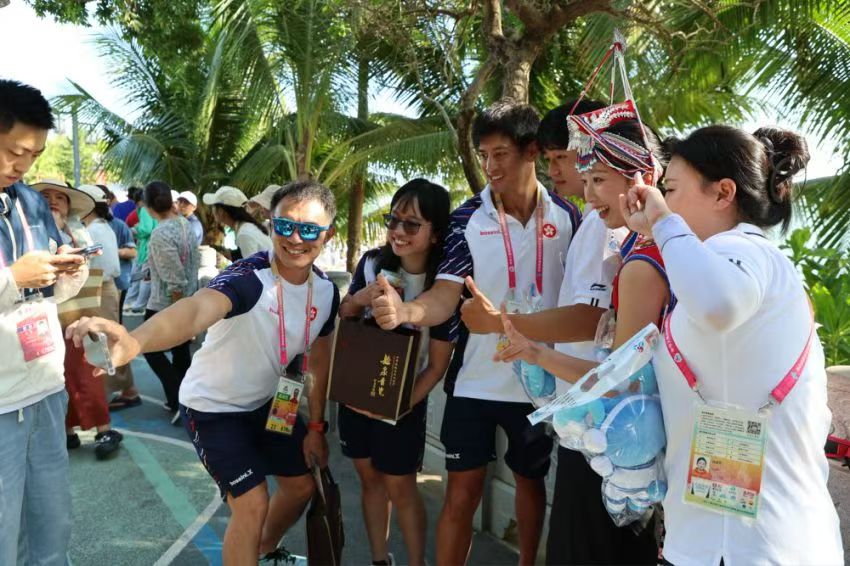 在运动会毽球场馆,每支参赛队伍都收到了香港代表团赠送的毽球挂饰或龙形胸针。西藏代表团的壮族小伙韦盛森计划回赠具有壮族特色的“绣球”;而早就与香港运动员因毽球结缘的广东队老将孙丽艳则决定——等香港队在圣诞节到广东集训时,她要给老朋友回赠实用的礼物。