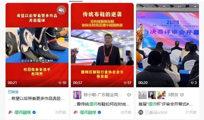 · 社交生态矩阵化渗透:在微信公众号平台,运营“中国鞋服设计大赛”、“中国鞋类设计师联盟”、“服装与服饰设计师联盟”、“三基设”、“设计赛”等近20个专业账号进行系列内容推送;在小红书、抖音、哔哩哔哩、微博、快手、得物等平台,通过“设计赛”、“i-sneaker联盟”、“-郑剑雄-”等设计垂类KOL进行创意视频发布与话题互动;在传统媒体端,通过行业权威媒体、河南省和洛阳市官方媒体,如“偃师融媒”对整个大赛过程进行持续追踪报道,并在赛前和赛后对获奖选手、专家嘉宾、组织领导进行人物专访。作品征集期间,每日在超过百个微信、QQ行业及设计社群进行持续推广,形成裂变式传播效应。