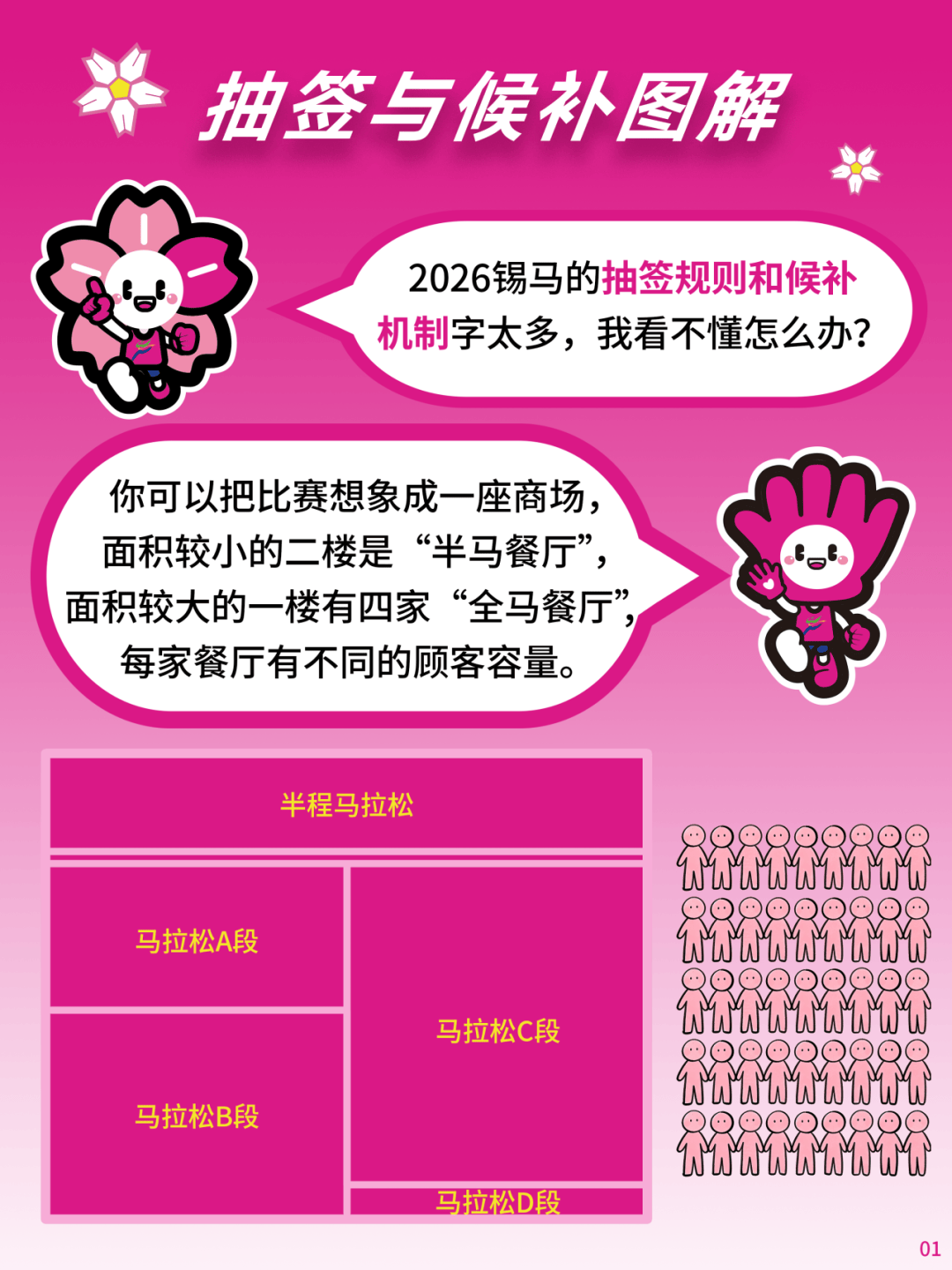 马拉松项目将设置A、B、C、D四个抽签段,可抽签名额总数的20%用于A抽签段、30%用于B抽签段、45%用于C抽签段、5%用于D抽签段,半程马拉松项目不设分段抽签;