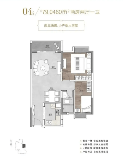 79㎡的 2 室 1 厅是项目的刚需热门户型,总价约 300 万元,得房率高达 82%,在同面积段户型中极具优势。南向朝向让房间冬天温暖明亮,采光充足,居住起来十分舒适。