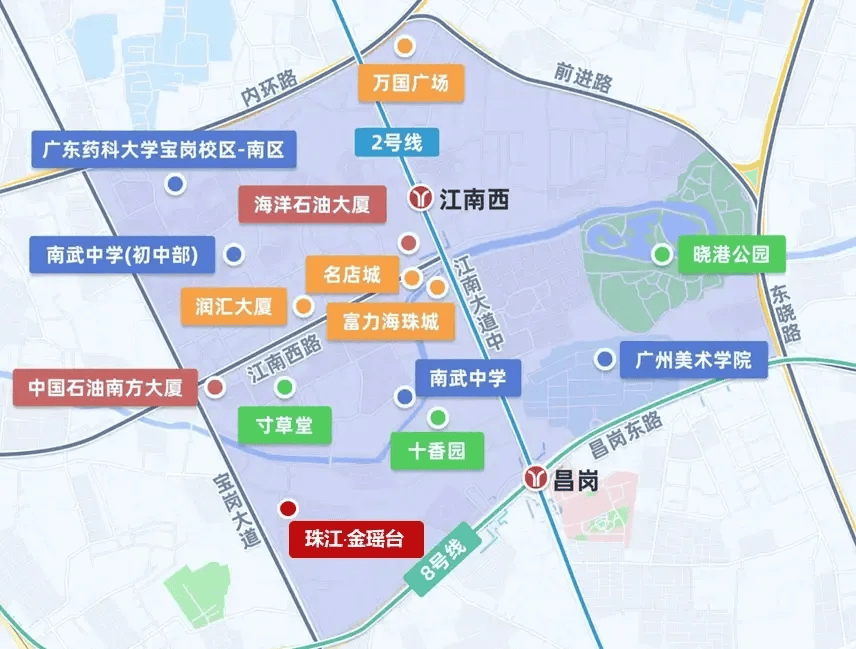 距离地铁 8 号线 号线串联起海珠、荔湾、天河等核心区域,从宝岗大道站出发,3 站可达昌岗换乘 2 号线 号线,无论是前往珠江新城上班,还是去北京路逛街,都十分便捷。