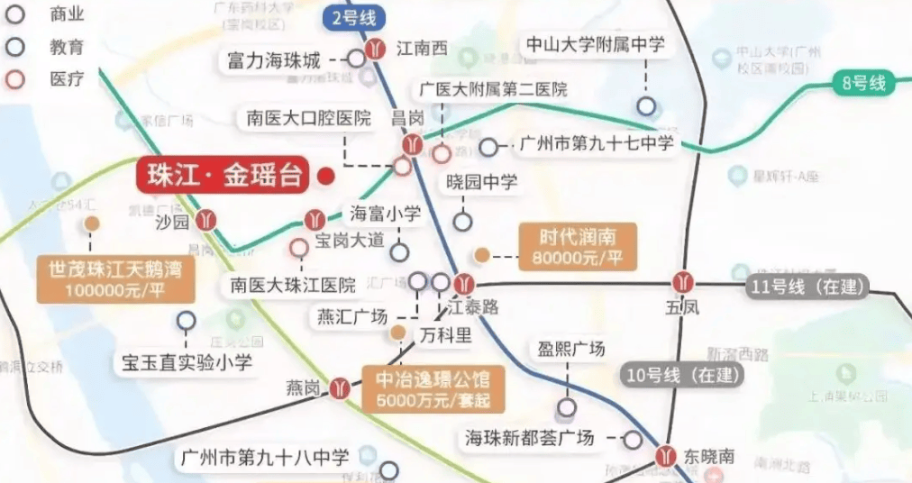 对于家庭居住来说,医疗资源的重要性不言而喻。珠江金瑶台 500 米内就有两所三甲医院 —— 广州医科大学附属第二医院和南方医科大学珠江医院,步行 10 分钟左右就能抵达。这两所医院在广州乃至全国都享有较高的知名度,医疗设备先进,医疗水平精湛,无论是日常感冒发烧等小病,还是定期体检、大病诊疗,都能得到及时专业的救治。