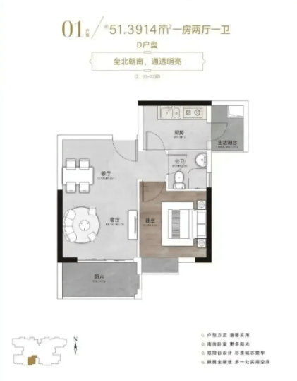 总价 194 万起的 51㎡1 室 1 厅,是单身人士或新婚夫妻的理想过渡居所。户型方正紧凑,没有浪费空间,客厅带小阳台,保证了日常采光和通风,让小空间也能拥有舒适的居住体验。