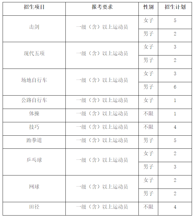 2.招生计划为拟定计划,包含保送录取优秀运动员,面向全国招生,不列分省计划。正式计划以“体育单招系统”公布为准,各项目招生计划不互调。