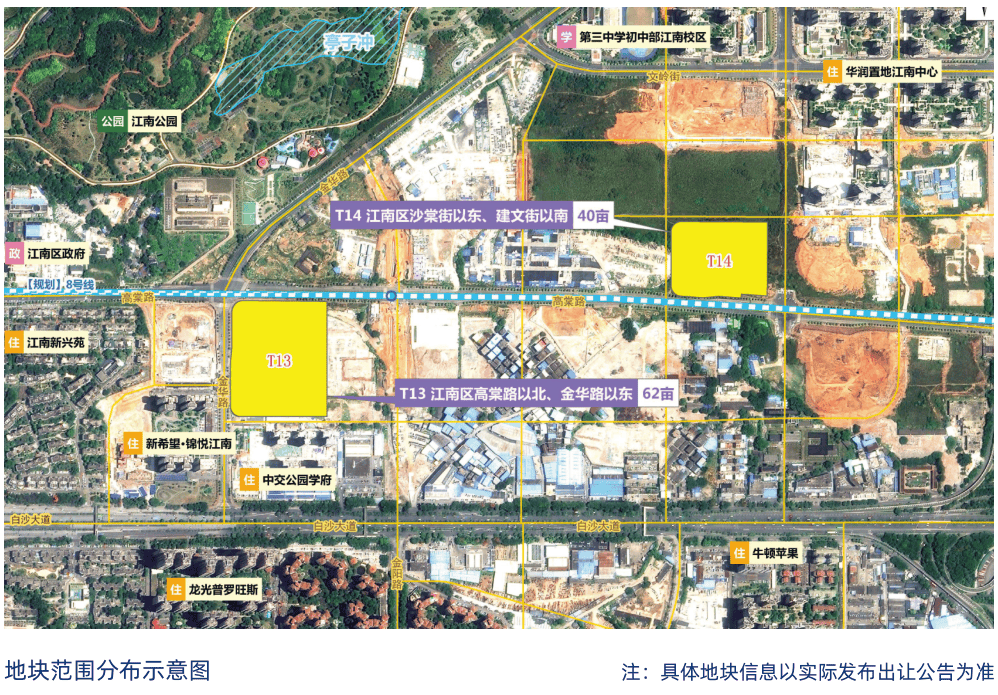 T14地块(40亩)位于江南区沙棠街以东、建文街以南,出让面积约40亩,土地用途为城镇住宅、商业,土地使用年限均为城镇住宅70年、商业40年。容积率1.5且≤2.8,商业建筑面积占总计容建筑面积的比例为1%-3%;绿地率≥35%,建筑高度≤80米。其他规划设计要求以实际发布出让公告为准。