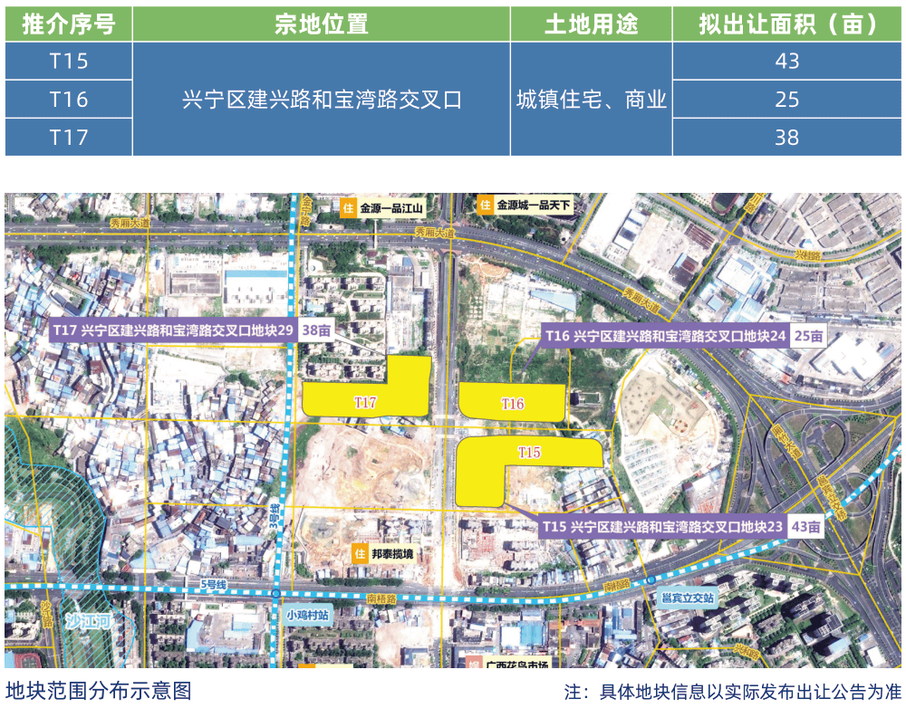 地块位于兴宁区建兴路和宝湾路交叉口,三幅地块均为鸡村城中村改造用地,土地用途均为城镇住宅、商业。其他规划指标待定。