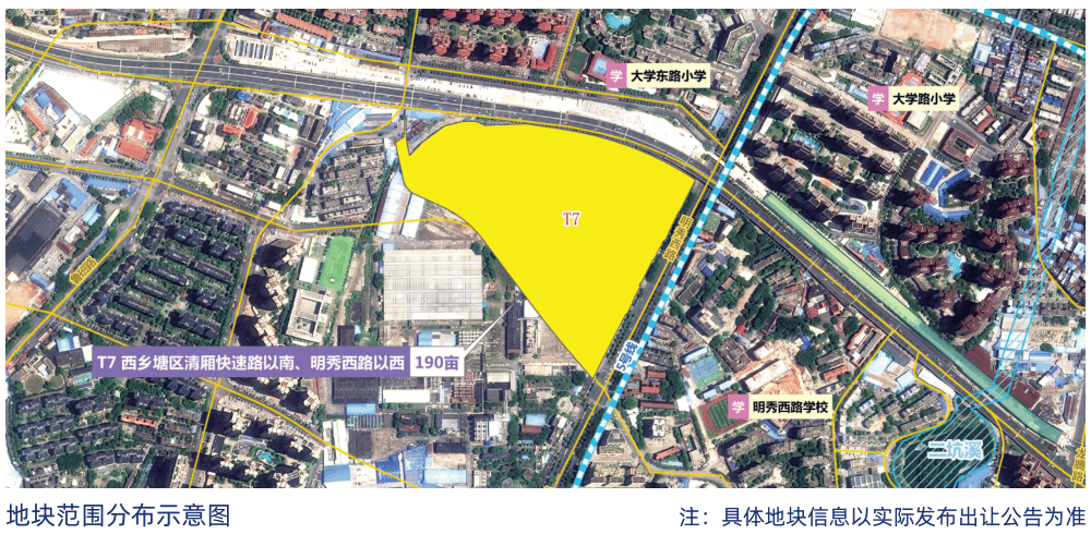 地块位于西乡塘区清厢快速路以南、明秀西路以西,拟出让面积约190亩,土地用途为城镇住宅。